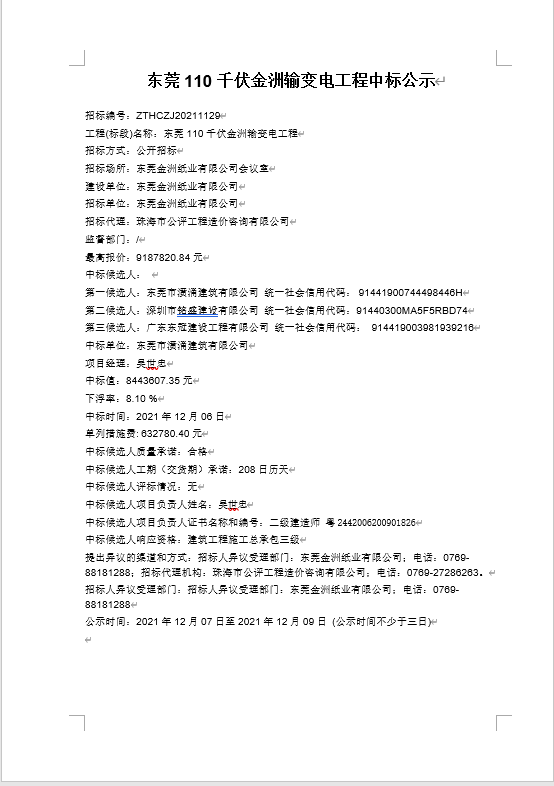 东莞110千伏(建洲)输变电配套线路工程中标公示