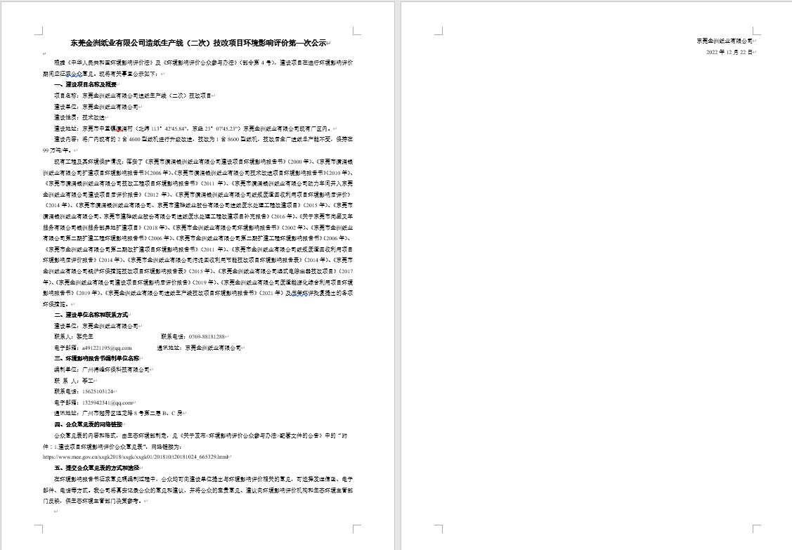 东莞金洲纸业有限公司造纸生产线(二次)技改项目环境影响评价第—次公示