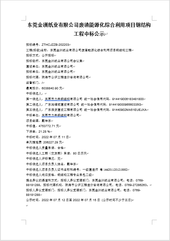 东莞金洲纸业有限公司废渣能源化综合利用项目钢结构工程中标公示