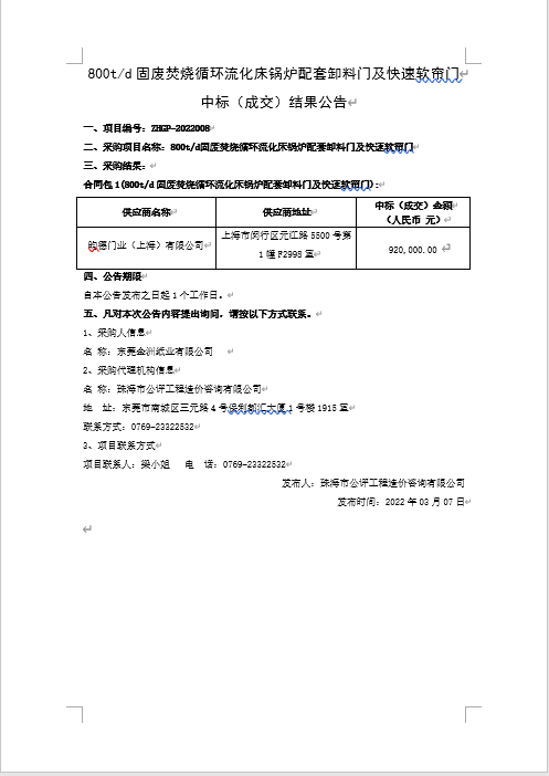 800t/d固废焚烧循环流化床锅炉配套卸料门及快速软帘门 中标(成交)结果公告