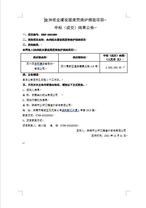 金洲纸业建设固废焚烧炉烟囱项目 中标(成交)结果公告