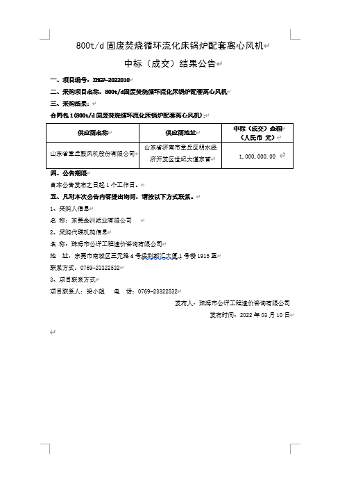 800t/d固废焚烧循环流化床锅炉配套离心风机 中标(成交)结果公告