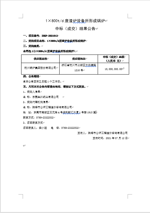 1×800t/d废渣炉设备所形成锅炉 中标(成交)结果公告