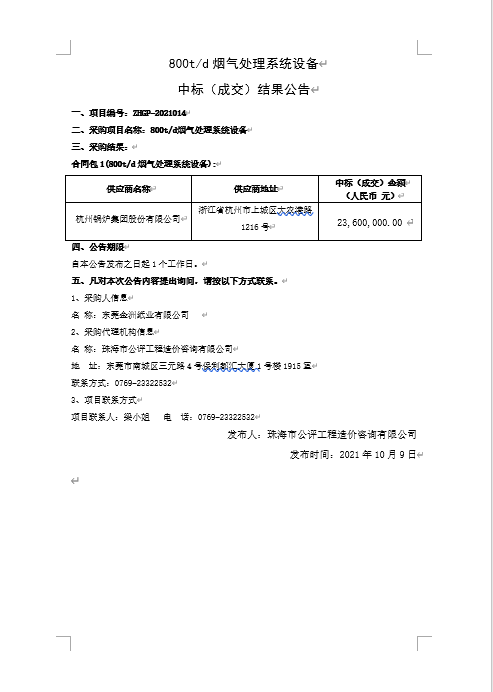 800t/d烟气处理系统设备 中标(成交)结果公告