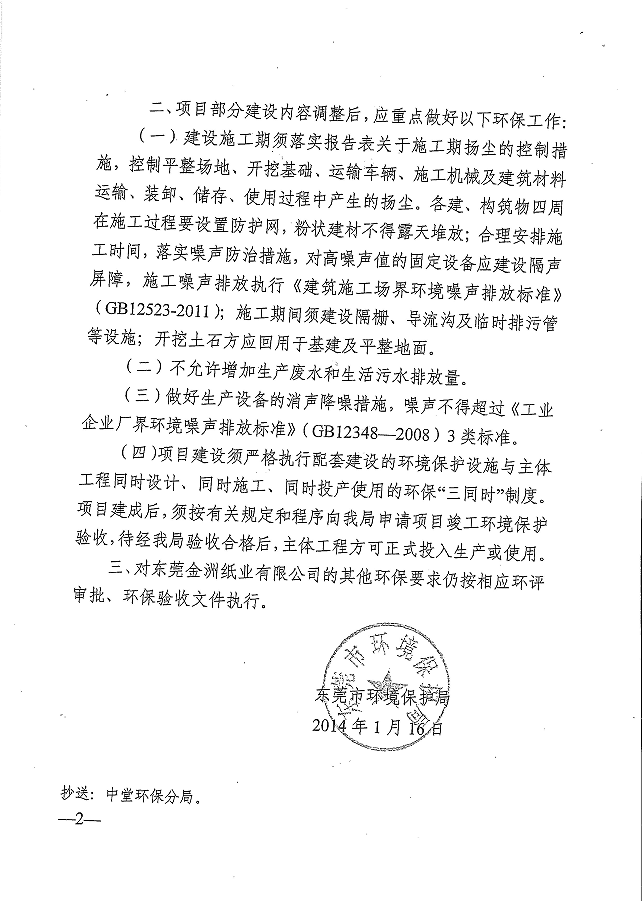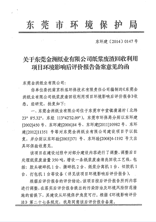 关于东莞金洲纸业有限公司纸浆废渣回收利用项目环境影响后评价报告备案意见的函