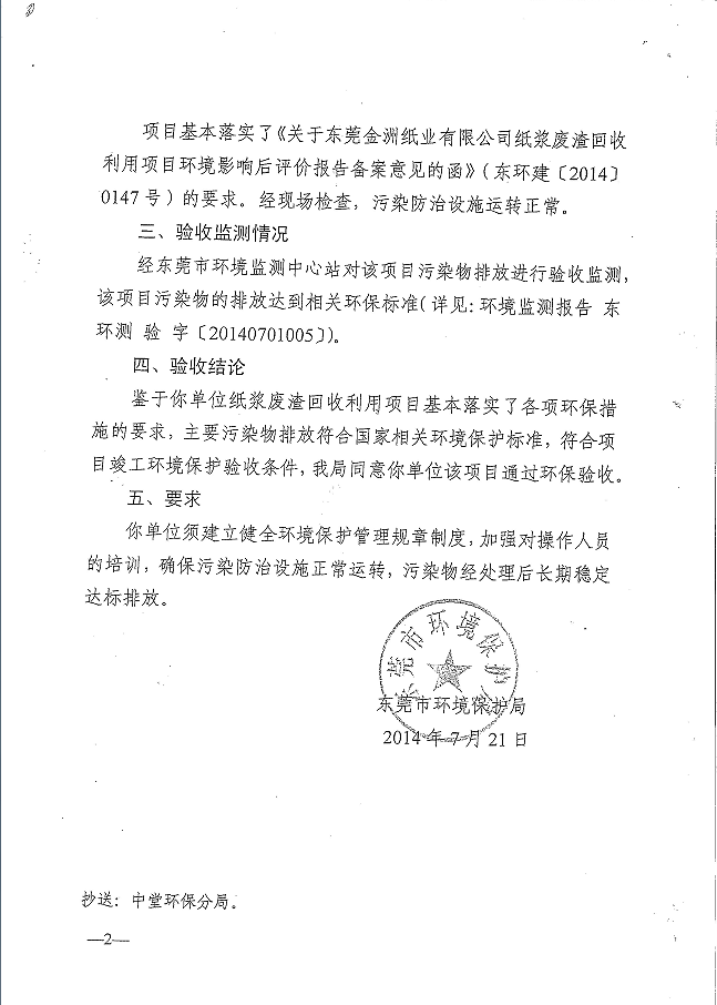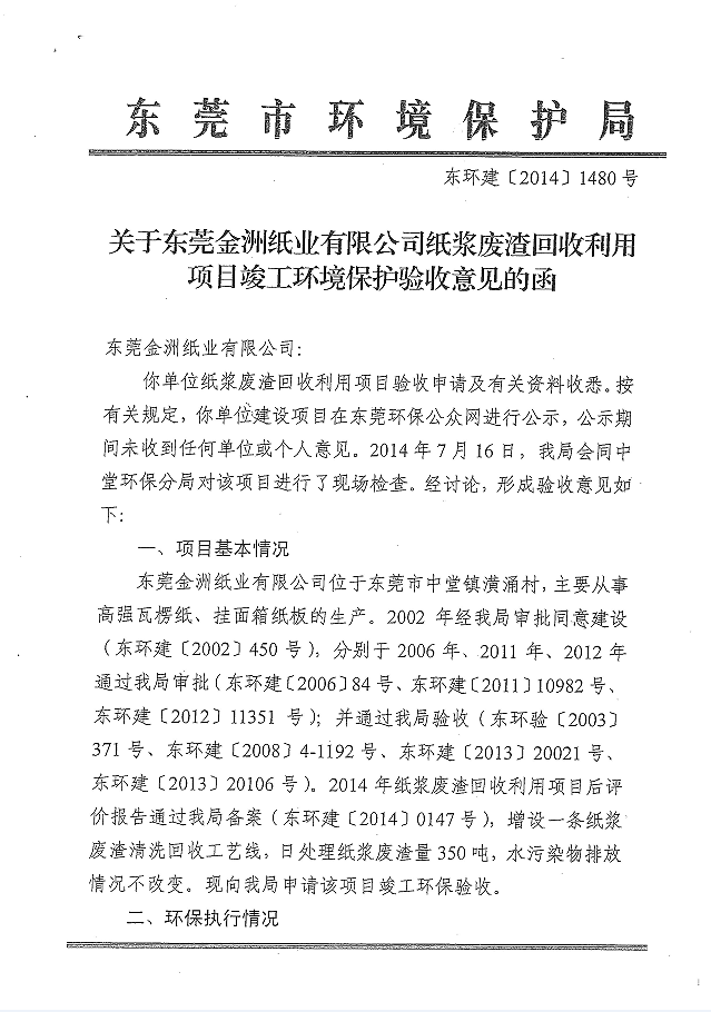关于东莞金洲纸业有限公司纸浆废渣回收利用项目竣工环境保护验收意见的函