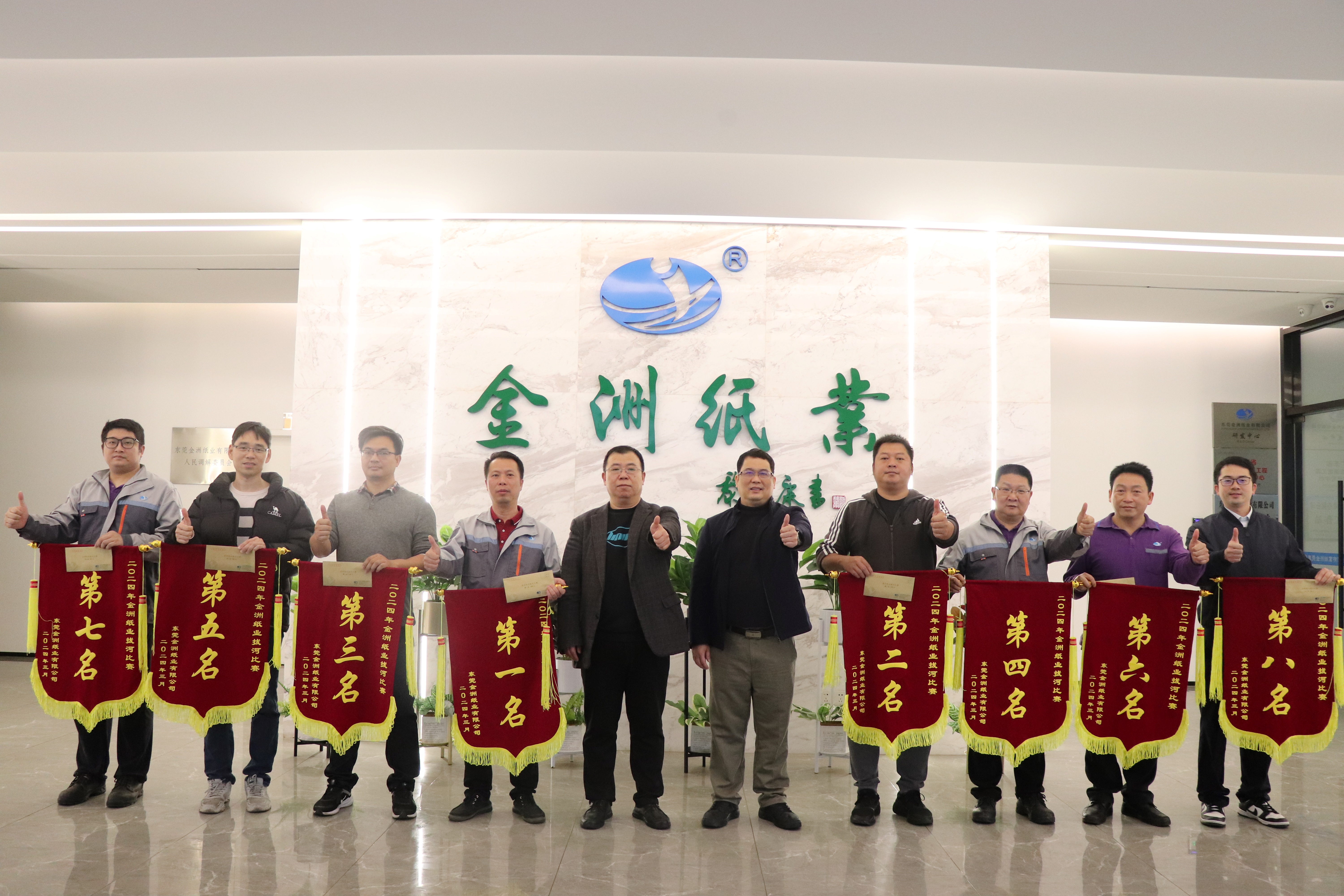 经过一个下午的激烈角逐,最终热电部以绝对的实力重夺桂冠,安监部创造了历史最好成绩获得第二,收购一部、制浆二部、环保部、 电气部、造纸二部、银洲环保包装则依次获得第三到第八名,公司生产副总经理庞军、行政副总经理黎静希现场为获奖的队伍颁发了奖旗和奖金并合影留念。至此,金洲纸业2024年拔河比赛圆满落下帷幕!